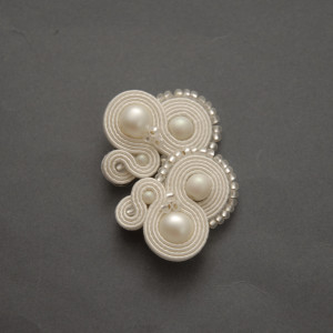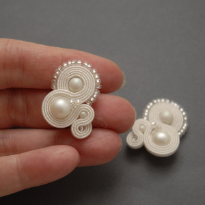 oferuję kolczyki lub klipsy zrobione techniką sutasz, ozdobione koralikami szklanymi imitującymi perełki matowe i drobnymi koralikami.