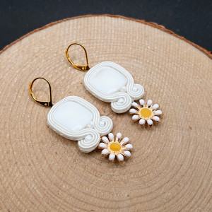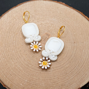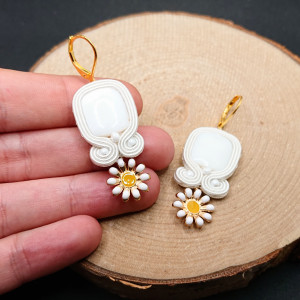 Kaboszony z muszli otoczone sznurkami sutasz oraz drobnymi szklanymi koralikami. Dół kolczyków zdobią metalowe zawieszki stokrotki. Kolczyki zawieszone na biglach angielskich w kolorze złota.