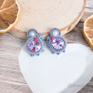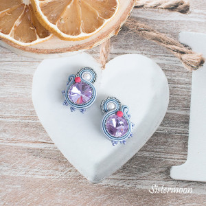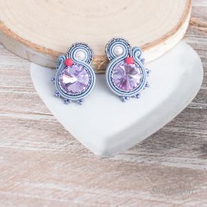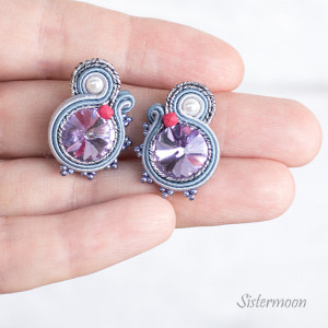 Małe kolczyki sutasz, lekkie, pełne uroku, mieniące się. Szklane kaboszony fasetowane rivoli, koraliki Toho, włoski i czeski sutasz, białe perełki Swarovskiego, sztyfty ze stali szlachetnej ukryte z tyłu kolczyka. Wysokość całkowita 2,5 cm, szerokość 1,5 cm. Spód wykończony naturalną skórką.