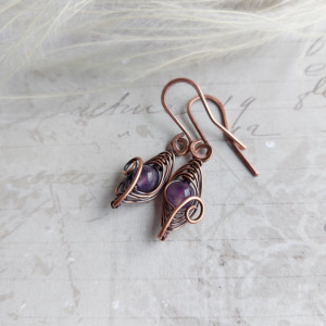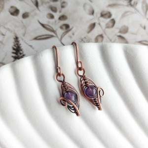 Małe miedziane kolczyki z ametystem. Druty są patynowane i wypolerowane, co nadaje im efekt głębi. Wybór kamieni naturalnych sprawia, że kolczyki stanowią idealny dodatek zarówno do codziennych jak i eleganckich stylizacji. Kolczyki przepięknie prezentują się na uchu i są idealnym pomysłem na prezent dla bliskiej osoby.