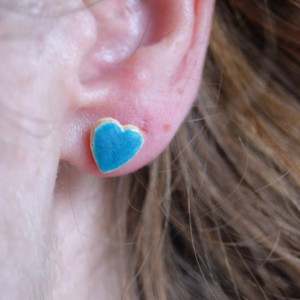 Śliczne małe ceramiczne kolczyki sztyfty w kształcie serduszek. Wykonane z lekkiej jasnej gliny pokryte niezwykłym zielononiebieskim błyszczącym szkliwem które nadaje im wyjątkowy wygląd.