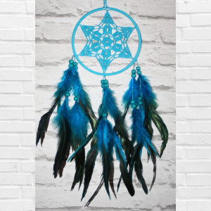 Wykonany ręcznie z bawełnianej nici. Jako zawieszka służy satynowa wstążeczka. Całość rozpięta jest na metalowej obręczy o średnicy 15 cm. Długość "frędzli" z piórek to około 29 cm.