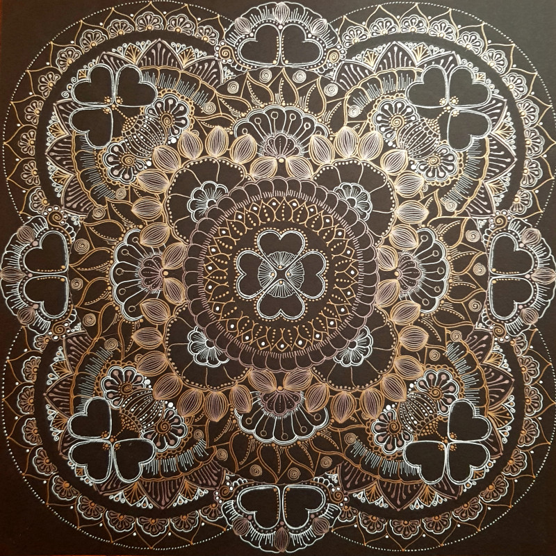 Ta misterna, koronkowa kompozycja złożona z wielu mniejszych mandali to oryginał narysowany odręcznie długopisami w kolorach białym, złotym, miedzianym i liliowym na czarnym papierze. Idealnie sprawdzi się jako dekoracja do Twojego wnętrza lub niezapomniany prezent.