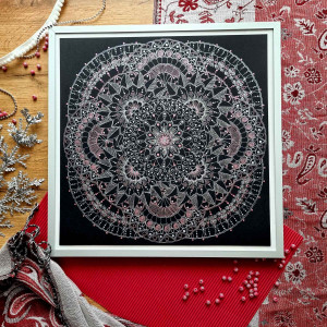 Ta misterna, koronkowa kompozycja złożona z wielu mniejszych mandali to oryginał narysowany odręcznie metalicznymy długopisami w kolorze srebrnym i czerwonym na czarnym papierze. Idealnie sprawdzi się jako dekoracja do Twojego wnętrza lub niezapomniany prezent.