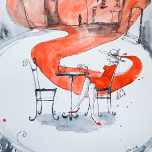 "Marzenie" akwarela z dodatkiem piórka artystki plastyka Adriany Laube wykonana na białym 300g papierze A3 (42cm x 30cm). Praca sygnowana, wysyłana w dobrze zabezpieczonej, kartonowej tubie, by dotarła do Państwa w idealnym stanie.
