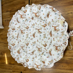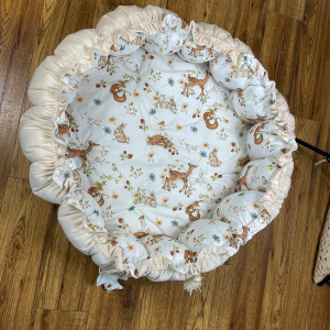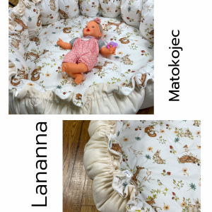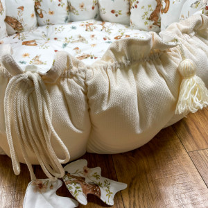 Produkt wykonany z materiałów przeznaczonych dla dzieci: bawełna premium polączona z velvetem, w środku antyalergiczne wypełnienie. Po rozwiązaniu sznureczka kojec zamienia się w matę o średnicy 140 cm.