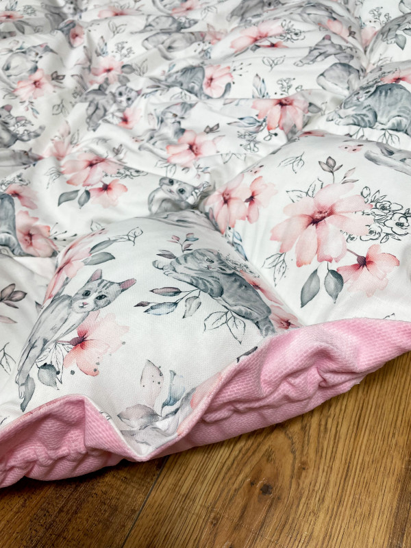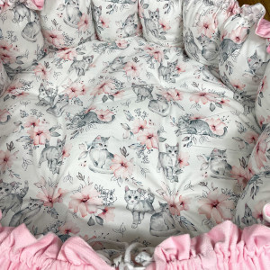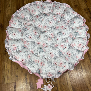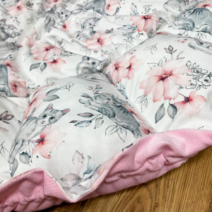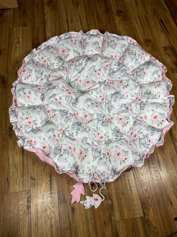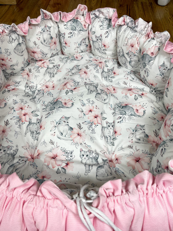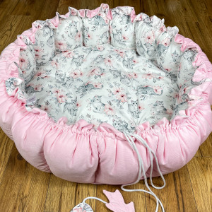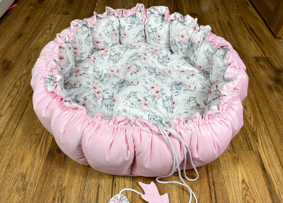 Produkt wykonany z materiałów przeznaczonych dla dzieci: bawełna premium polączona z velvetem, w środku antyalergiczne wypełnienie. Po rozwiązaniu sznureczka kojec zamienia się w matę o średnicy 140 cm.
