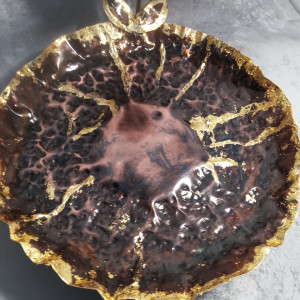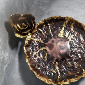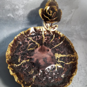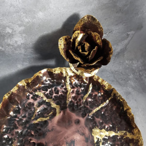 Miedziana patera z kwiatem róży.