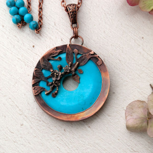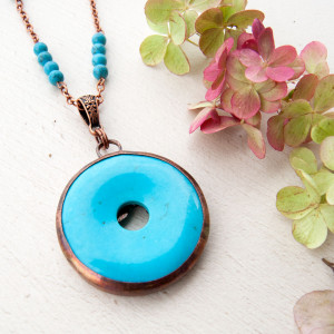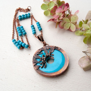Wspaniały i okazały naszyjnik z niebieskim wisiorem o lazurowej barwie. Przepiekny, recznie robiony idealnie sprawdzi si na wieczorne wyścia. Dodaje nam luksusu i pewności siebie. Wisior jest dwustronny. Na jednej stronie są wspaniałae kwiatowe motywy. Druga strona jest minimalistyczna.
