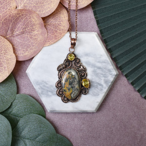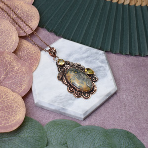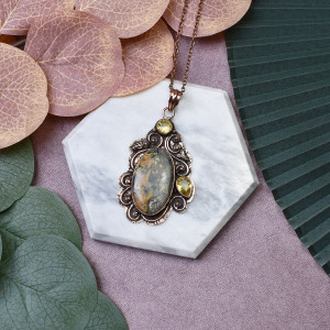 Wisiorek z miedzi z jaspisem i cytrynem to nie tylko wyjątkowy dodatek do biżuterii, ale również nosi ze sobą unikalne właściwości kamieni. Jaspis, znany ze swojego pięknego, ciepłego koloru, symbolizuje siłę i stabilność. Pomaga w zwiększeniu energii życiowej oraz rozwijaniu odwagi. Cytryn, o intensywnym złotym odcieniu, jest kamieniem optymizmu, stymulującym kreatywność i jasne myślenie. Miedź natomiast, używana od wieków ze względu na swoje właściwości lecznicze, wspiera przewodzenie energii i równowagę emocjonalną. W połączeniu te trzy elementy tworzą nie tylko elegancką biżuterię, lecz także amulet, który może przynieść harmonię, siłę i pozytywne wibracje noszącemu.