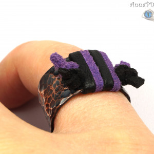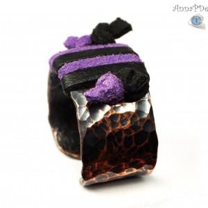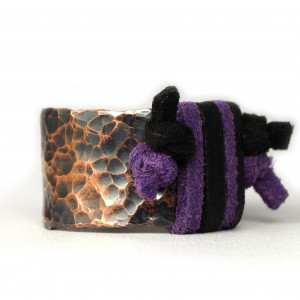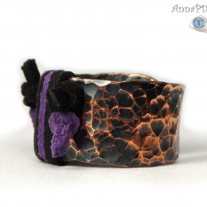 Misternie wykonany pierścionek z czarnym i fioletowym rzemieniem. Obrączka wykonana z młotkowanej miedzi i ze skórzanego rzemienia. Całość mocno patynowana, polerowana i przecierana. Czarny i fioletowy skórzany rzemień oplata grubą regulowaną obrączkę. Średnica obrączki wewnętrzna: 16.6 mm - 18.33 mm Rozmiar obrączki: 13 EU- 18 EU ( 6- 8 USA ) Szerokość obrączki: 12 mm Biżuteria zostanie zapakowana w ozdobne pudełeczko.