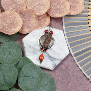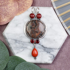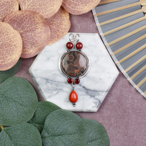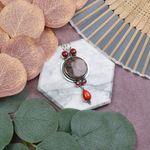 Miedziany posrebrzany ozdobny wisiorek z jaspisem i koralem #612