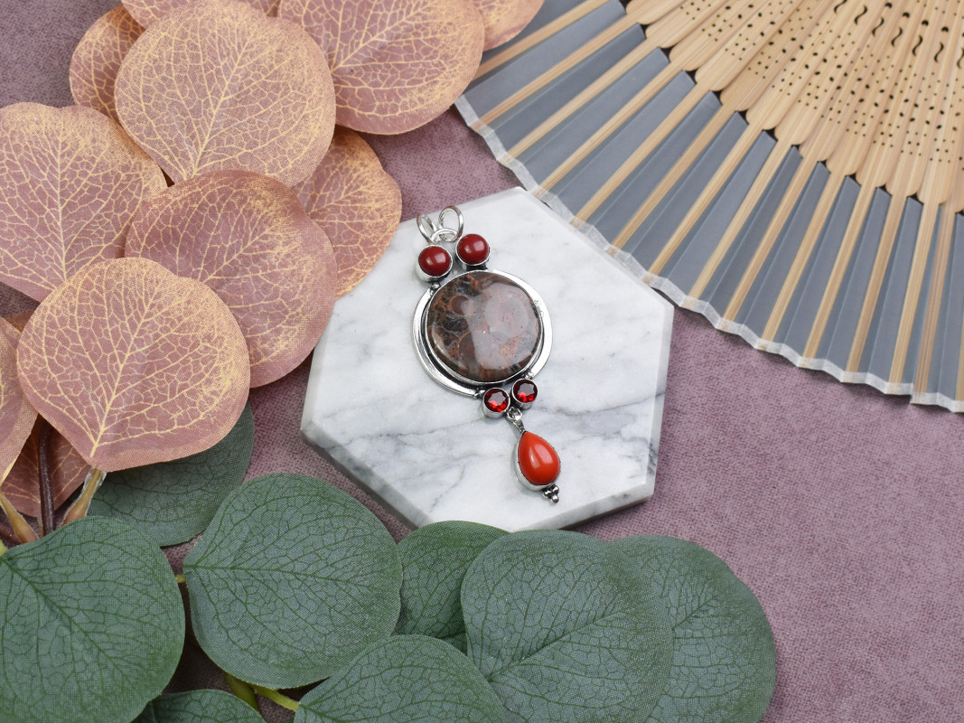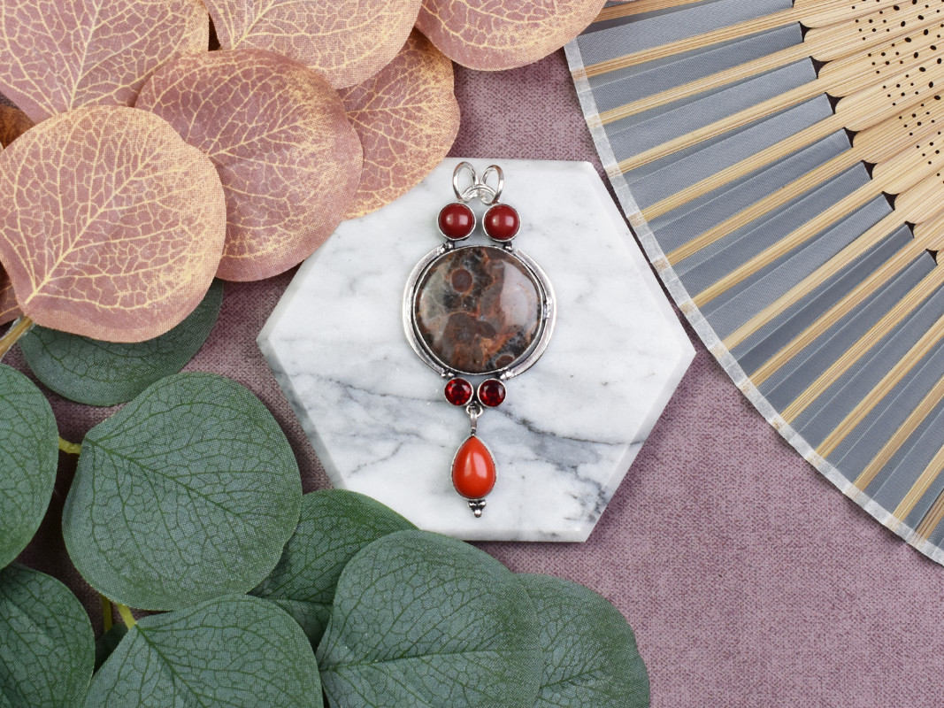 Ręcznie wykonany wisiorek z miedzi, pokryty srebrem próby 925, z dużym jaspisem Mexican Bird Eye oraz małymi granatami i koralem. Jaspis Mexican Bird Eye to kamień wspierający stabilność i ochronę, pomagający w zachowaniu równowagi emocjonalnej oraz wzmocnieniu wytrwałości. Małe granaty symbolizują pasję, energię i odwagę, natomiast koral dodaje wisiorkowi naturalnej elegancji oraz pozytywnych wibracji, kojarzonych z ochroną i spokojem. Połączenie tych kamieni tworzy wisiorek o silnym działaniu ochronnym, wspierający wewnętrzną siłę i równowagę, idealny do noszenia na co dzień.