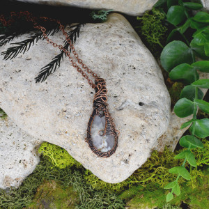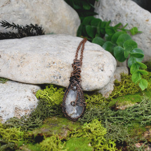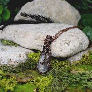 Ręcznie wykonany wisior w technice wire wrapping. Wire wrapping jest jedną z najbardziej efektownych technik tworzenia biżuterii. Nazwa oznacza dokładnie „owijanie drutem”. Drut jest patynowany i polerowany.