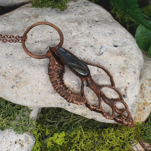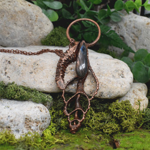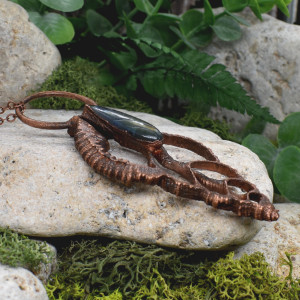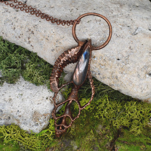 Ręcznie wykonany wisior z labradorytem i muszlą ogromnego ślimaka zwaną trąbą Trytona. Oprawa wykonana z miedzi metodą elektroformowania, patynowana.