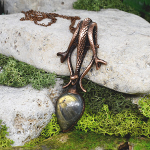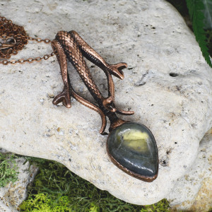 Ręcznie wykonany wisior z labradorytem ozdobiony wężami przypominającymi głowę Hydry. Oprawa wykonana z miedzi metodą elektroformowania, patynowana.