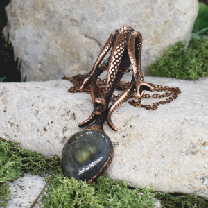 Miedziany wisior z labradorytem i wężami #107