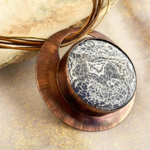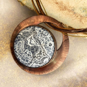 Wisior został wykonany ręcznie z blachy miedzianej i okrągłego trawionego agatu. Kamień ma średnicę 45 mm i cechuje się charakterystycznym wzorem na powierzchni. W procesie tworzenia wisiora blacha była polerowana, matowiona, a następnie malowana oksydą i przecierana, dzięki czemu powstał niepowtarzalny efekt kolorystyczny. Blacha otaczająca agat jest lekko wypukła oraz zabezpieczona warstwą ochronną. Miedziane koło, którego centralnym elementem jest jedyny w swoim rodzaju agat, ma średnicę ok 7 cm.