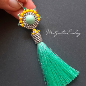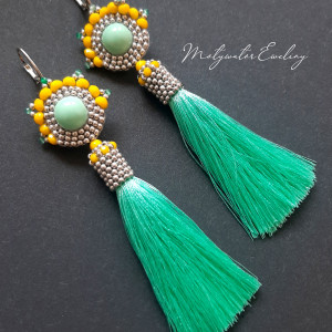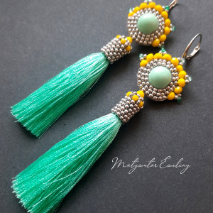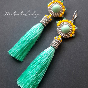 Kolczyki wiszące z miętowymi chwostami, wykonane techniką swoistego haftu drobnymi, szklanymi koralikami w zielonej, cytrynowej i srebrnej kolorystyce w połączeniu z drobnymi, szlifowanymi koralikami agatu zielonego. Dwustronne, podwieszone na biglach posrebrzanych i nieuczulających typu angielskiego. Wymiary: długość wraz z zapięciem - 11 cm, szerokość max. 2,8 cm.