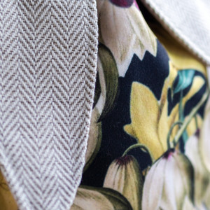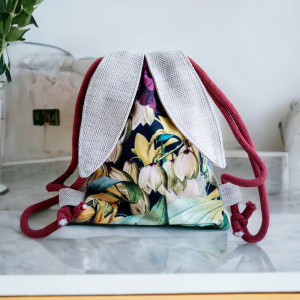 Dziecięcy plecaczek worek wykonany z jasnej tkaniny ecru w jodełkę oraz weluru w żonkile. Uszy królika. Bawełniane sznurki w dzikiej róży.