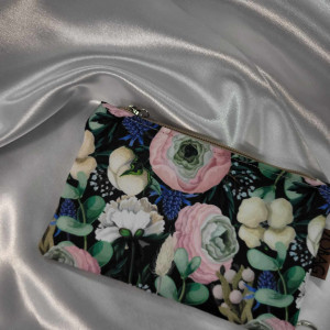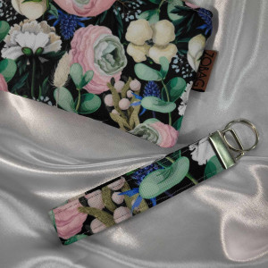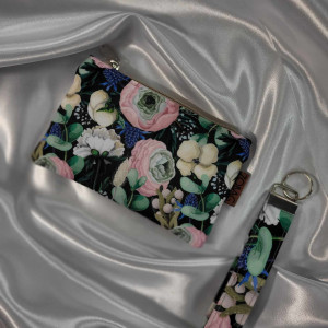 Portfelik na karty kredytowe, banknoty czy monety, zapinany na zamek. Do kompletu w tym samym materiale brelok do kluczy.