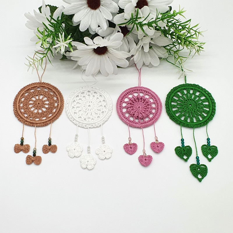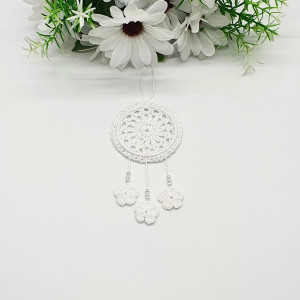 Mini zawieszka w kolorze białym, wykonana na szydełku, z kordonka, wykończona koralikami i kwiatuszkami. Do samochodu i nie tylko. Średnica 5 cm, długość 12,5 cm.
