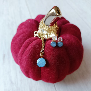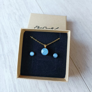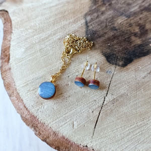 Piękny, minimalistyczny i delikatny naszyjnik - celebrytka z zawieszką w postaci malutkiego drewienka malowanego ręcznie farbą akrylową w błękitnym metalicznym kolorze i pokrytego błyszczącą żywicą. W komplecie kolczyki typu sztyfty z malutkimi drewienkami pasującymi do zawieszki naszyjnika.