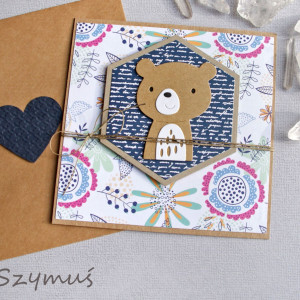 urocza kartka z okazji narodzin bobasa/ chrztu lub urodzinek - wykonana na bazie kartonu eko-kraft (100% makulatury), ozdobiona wzorzystym kartonem (luba faturowanym kartonem jednokolorowym - w zależności od modelu) ; na środku zamocowany duży, przestrzenny element z przesłodkim misiem; kartka przewiązana jutowym sznureczkiem.