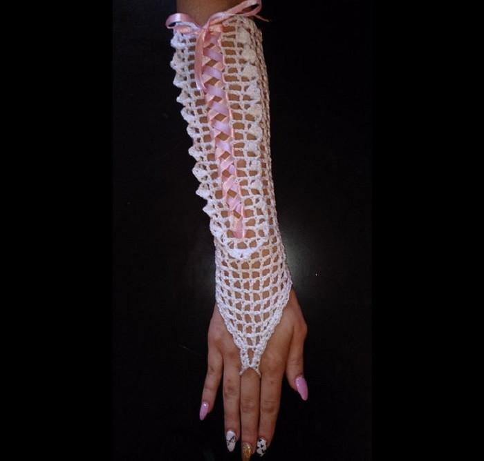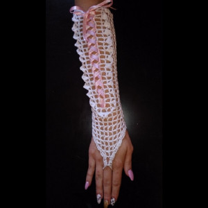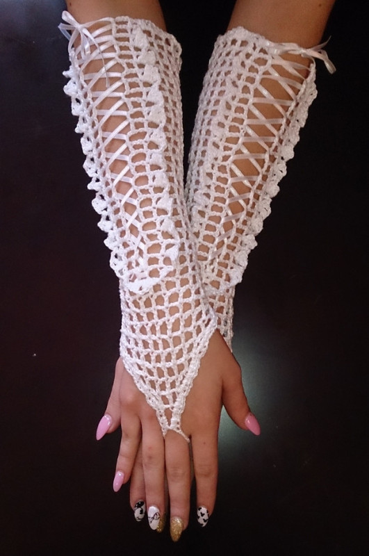 Mitenki koronkowe sznurowane, wykonane ze śnieżnobiałego cienkiego 100% bawełnianego kordonka. Długość (liczona bez pętelki na palec) 30 cm. Rozmiar uniwersalny. Sznurowane wstążką na wzór gorsetowy, dzięki czemu dopasują się do każdego obwodu ręki. Kolor wstążki do uzgodnienia (na zdjęciach 2 przykładowe kolory wiązania- białą wstążką i różową). Mitenki będą pięknym i oryginalnym dodatkiem ślubnym lub komunijnym. Autorski projekt i wykonanie. Na życzenie, po uprzednim uzgodnieniu możliwość wykonania w innym kolorze lub wzorze zgodnie z Państwa sugestiami. Zdjęcie stanowi wzór, czas realizacji ok. 7-10 dni. Przy zamawianiu proszę o podanie koloru wstążki.