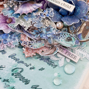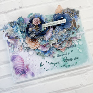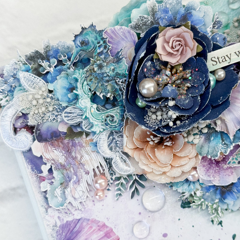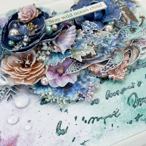 To bogato zdobiona, przestrzenna kompozycja z motywem morskim, pełna detali: kwiatów, grafik, koronek, brokatu i faktur, które przyciągają wzrok i zapraszają do zanurzenia się w baśniowy klimat oceanu.