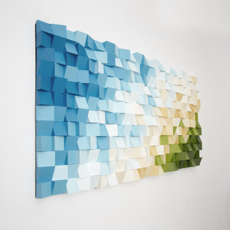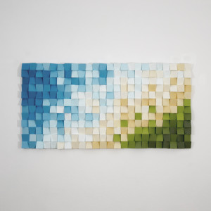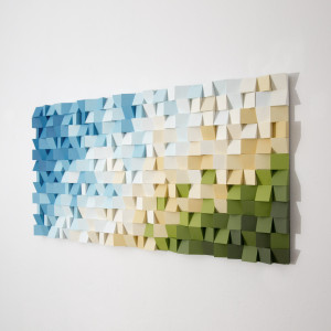 Mozaika drewniana, wykonana z sosnowych kostek, przytwierdzonych do płyty MDF.