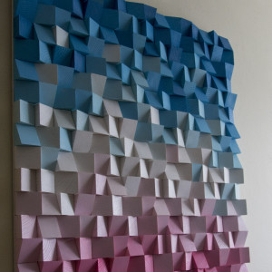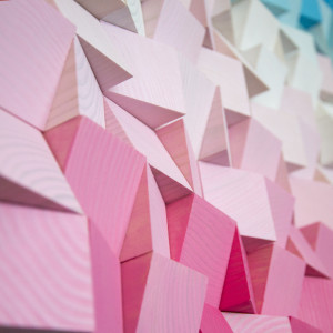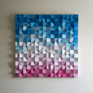 Mozaika drewniana, wykonana z sosnowych kostek, przytwierdzonych do płyty OSB.