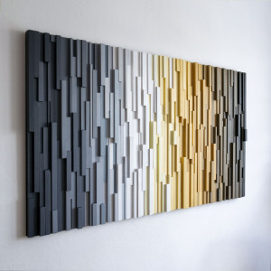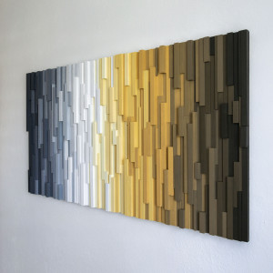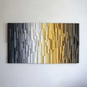 Produkt na zamówienie, czas realizacji 2 tygodnie. Mozaika drewniana wykonana z deseczek przytwierdzonych do płyty OSB. Każda z kostek mozaiki została ręcznie wycięta, wyszlifowana i pomalowana. Wymiary mozaiki: 135x75x4 cm. Waga: ~10 kg. Na odwrocie mozaika ma przytwierdzone zawieszki.