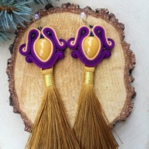 Witam, mam na sprzedaż długie kolczyki szyte przeze mnie w technice sutaszu. Kolczyki uszyte są ze sznurków polskich, w kolorach: fioletowym i musztardowym. Kaboszony są wykonane z żywicy. Kolczyki wykończone są na dole długimi, złotymi chwostami.