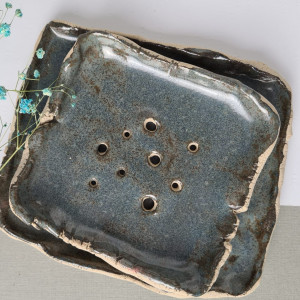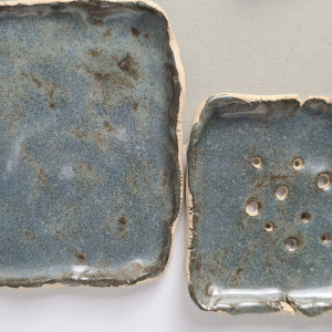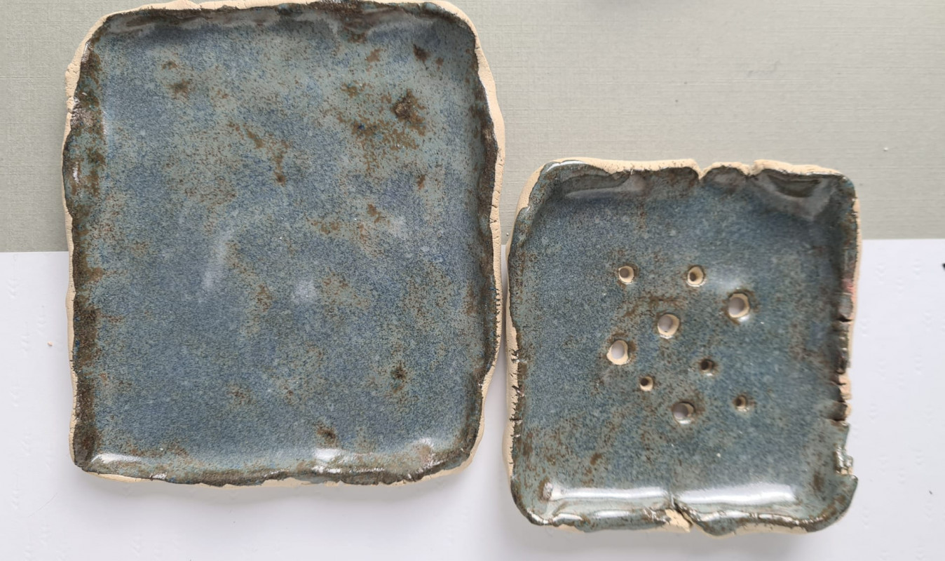 Jasna, beżowa glina szkliwiona w kolorze ziemnej szarości z odrobiną brązu. Szkliwo kryjące. Brzegi nie szkliwione.
