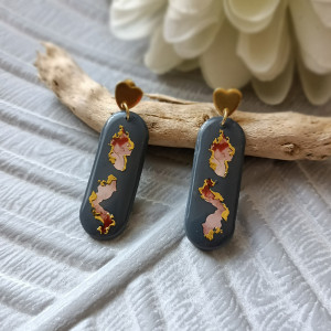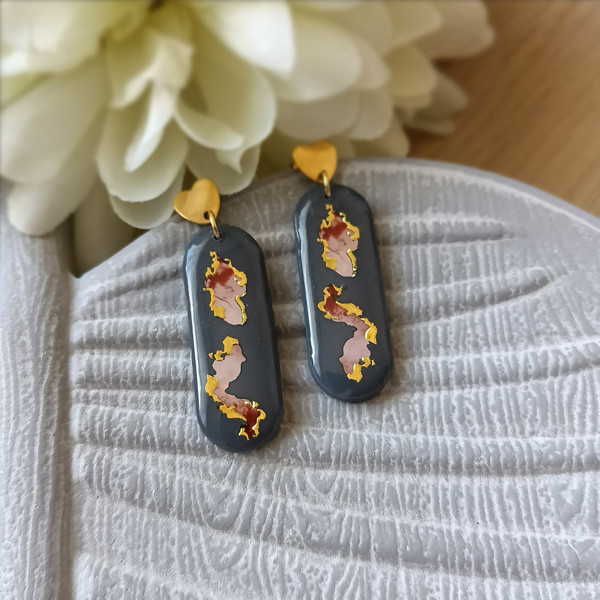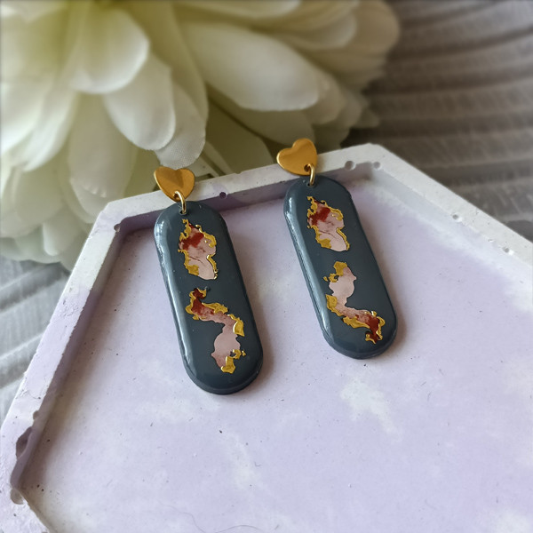 Kolczyki zostały wykonane w całości ręcznie z wysokiej jakości glinki polimerowej. Jest to materiał bardzo trwały, lekki i odporny na wszelkiego rodzaju czynniki zewnętrzne. Kolczyki są w kolorze ciemnoszarym z delikatnym ornamentem. Kolczyki pokryte są żywicą epoksydową. Elementy metalowe są ze stali chirurgicznej w kolorze złotym. Całkowita długość kolczyków 4,5 cm, szerokość 1,5 cm. Są bardzo lekkie i pasują do każdej stylizacji na każdą porę dnia. Biżuteria pakowana jest w ozdobne pudełko.