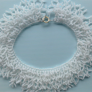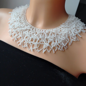 Duży naszyjnik z białych koralików crystal szklanych, malutkich okraglych ok 2 mm, delikatne gałązki pięknie układają się wokół szyi, falują łagodnie z każdym ruchem, naszyjnik mimo ogromu koralików nie jest ciężki.Bardzo efektowny.Idealna biżuteria sztuczna z okazji ślubu i innych. Zapięcie ozdobne metal w kolorze srebra.Ten model cieszy się powodzeniem u panien młodych.Objętość wokół szyi 40 cm