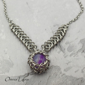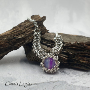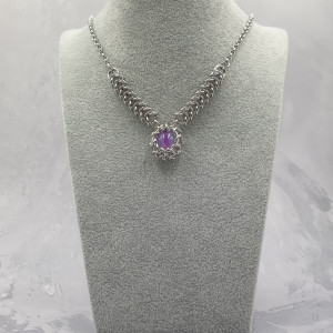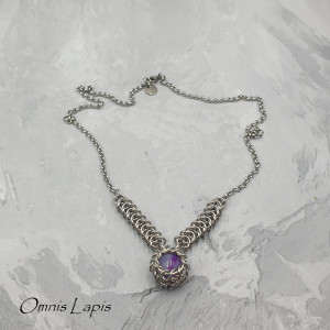 Prezentowany naszyjnik wykonałam z ogniwek ze stali szlachetnej, ozdobiłam kulą agatu w kolorze fioletowym.