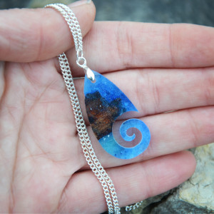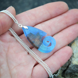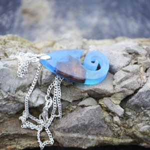 Wisiorek wykonany z barwionej żywicy epoksydowej z kawałkiem drewna. Po odlaniu elementy zostały wyszlifowane i wypolerowane. Elementy wisiorka zostały zawieszone na czarnym drucie. Wisiorek zawieszony na srebrnym łańcuszku