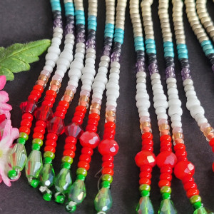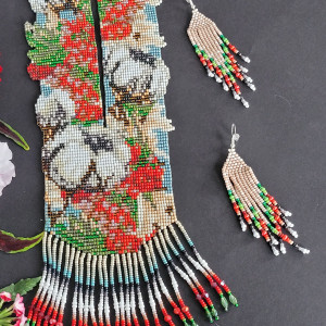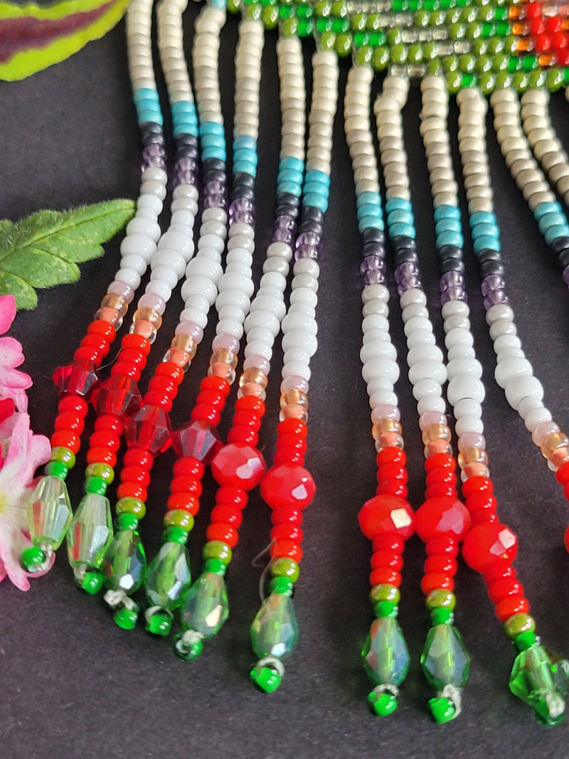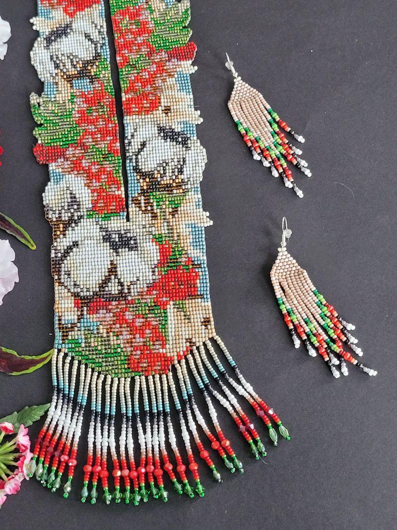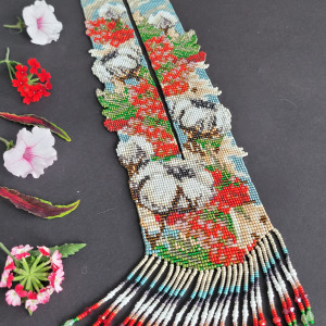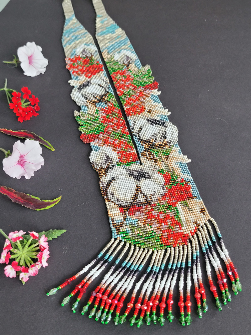 Naszyjnik koralikowy gerdan Kwiaty Bawełny Kalina z frędzliami
