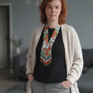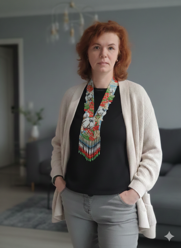 Sprzedam wyjątkowy, ręcznie tkany naszyjnik typu gerdan, który jest połączeniem artystycznego kunsztu i głębokiej symboliki. Ten misternie wykonany dodatek przedstawia unikalny motyw: delikatne kwiaty bawełny oraz soczyste owoce kaliny, wplecione w malowniczy krajobraz.