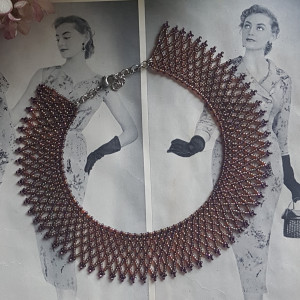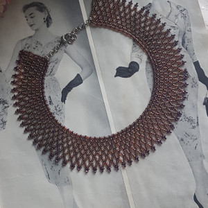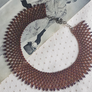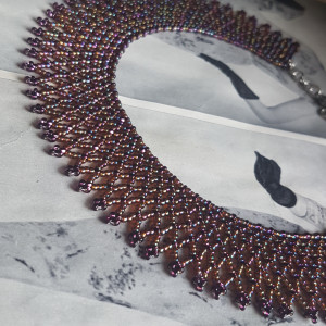 Naszyjnik wypleciony z pieknych koralików w kolorze ciemnego fioletu z efektem benzynki. Misterna plecionka w formie krywulki. Szerokość 3,3 cm, objętość 32-36 cm, Zapięcie ze stali chirurgicznej w kolorze srebrnym.