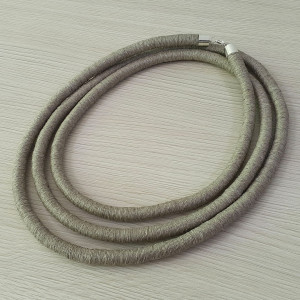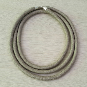 Ten mega długi naszyjnik wykonano z naturalnej, surowej przędzy lnianej przez owijanie. Ma nieregularną fakturę i lekko sztywną formę. Zależnie od fantazji właścicielki można go nosić na wiele sposobów! Posiada nieuczulające, metalowe zapięcie na karabińczyk w srebrnym kolorze.