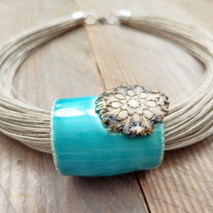 Na bazie z lnu zawieszona ozdoba wykonana z ceramiki. Prezentuje się elegancko i wytwornie. Wielkość ozdoby 4-5 cm. Długość naszyjnika około 47 cm. Zapięcie ze stali szlachetnej.