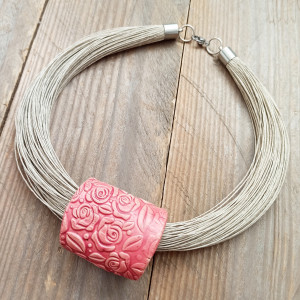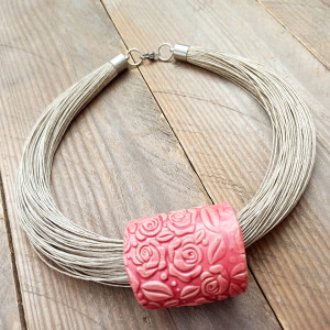 Na bazie z lnu zawieszona ozdoba wykonana z ceramiki. Prezentuje się elegancko i wytwornie. Wielkość ozdoby 4-5 cm. Długość naszyjnika około 47-50 cm. Zapięcie ze stali szlachetnej.