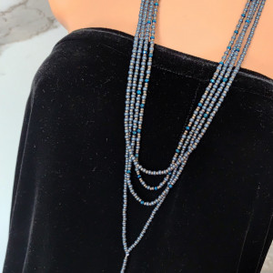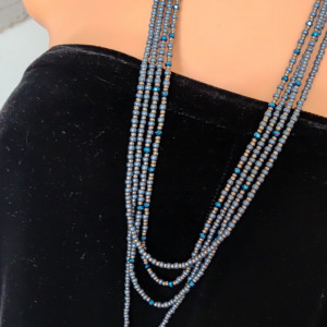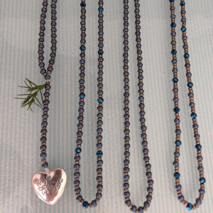 Naszyjnik cztery sznury korali szklanych 4 mm, kryształki granatowe i przekładki w kolorze starego srebra. Zawieszka metalowa z napisem mama w kształcie serduszka 2 cm, naszyjnik na sznurku syntetycznym. Długość 50 cm max