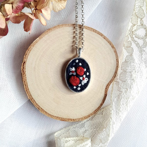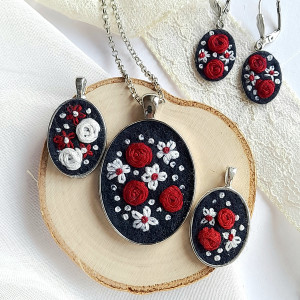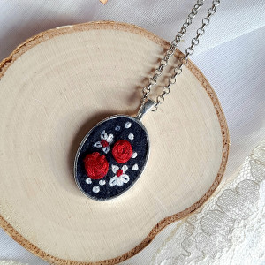 Delikatny, haftowany ręcznie naszyjnik z kompozycją róż i stokrotek w kontrastowych kolorach dla wielbicielek subtelnej biżuterii. Granatowe tło wydobywa biel i bordo kwiatowego wzoru.