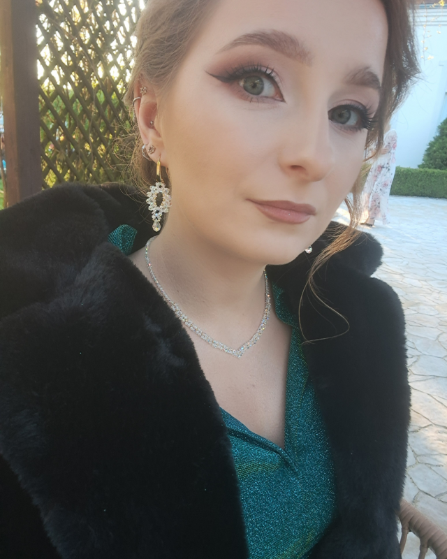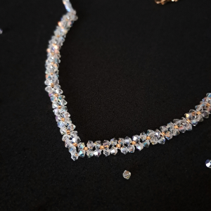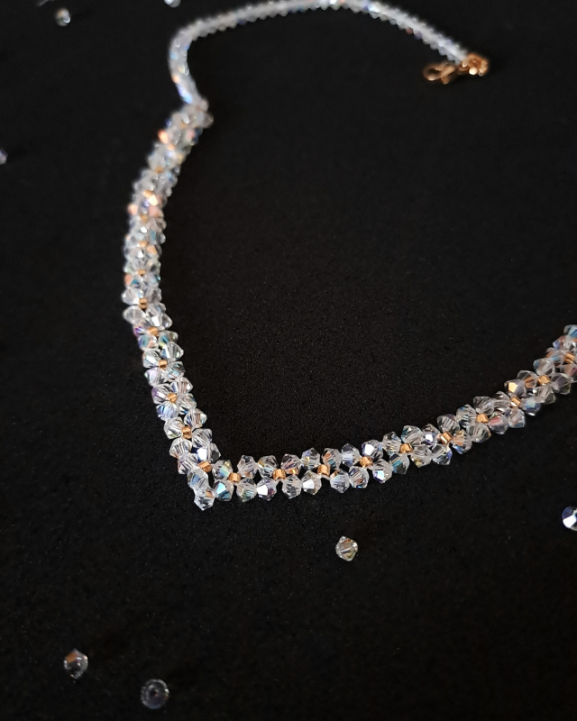 Zanurz się w blasku, który hipnotyzuje. Ten złoty naszyjnik ślubny to nie tylko dodatek - to opowieść o Tobie. Każdy drobny kryształek Preciosa Crystal AB odbija światło jak najpiękniejszy promień nadziei, oplatając dekolt świetlistą poświatą. Misterny, ręcznie pleciony wzór w kształcie litery V wysmukla szyję i przyciąga światło jak zwierciadło szczęścia. Całość osadzona jest na stabilnych, eleganckich elementach ze stali chirurgicznej, które gwarantują trwałość - nawet podczas najbardziej intensywnych chwil na parkiecie.Biżuteryjny Statement - Naszyjnik, Który Mówi: „To Mój Moment”