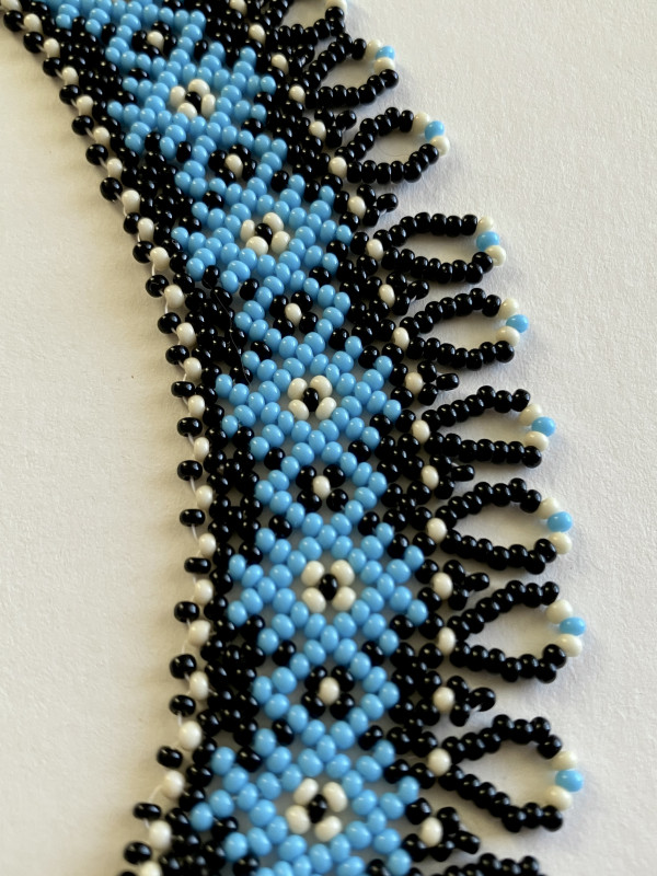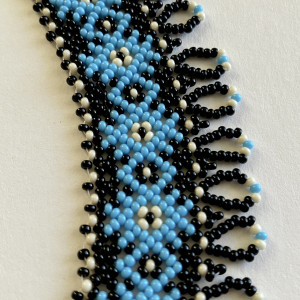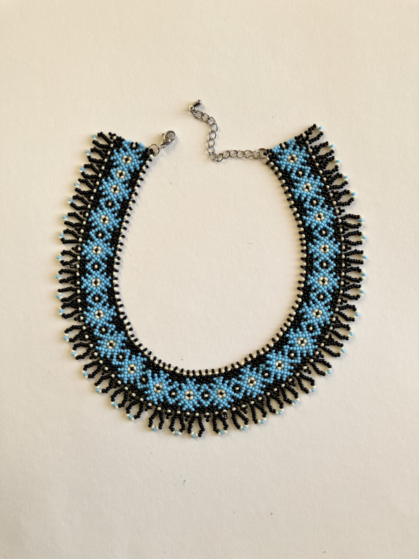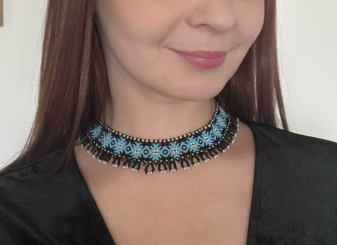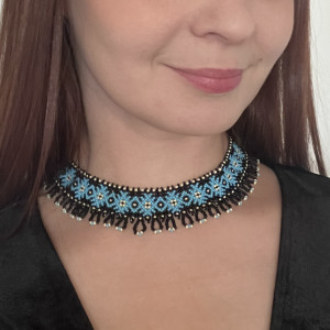 Elegancki i efektowy naszyjnik typu "sylianka" ręcznie utkany ze szklanych koralików, wiele godzin pracy. Czarne koraliki stanowią tło dla turkusowego wzoru z kremowymi akcentami. Dzięki łańcuszkowej przedłużce można nosić go na dwa sposoby: blisko szyi jak choker, albo luźniej zapięty jako dłuższy naszyjnik. Ten model świetnie wygląda też założony na golf.
