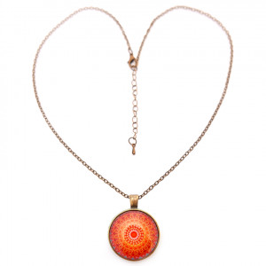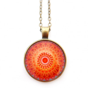 Wisiorek z unikatowym motywem w stylu etno, boho chic. Piękny wisiorek z motywem kolorowej mandali w metalowej oprawie stylizowanej na stare złoto. Grafika z mandalą (o średnicy 25 mm) jest zamknięta pod wypukłym, polerowanym szkiełkiem, co nadaje mandali blasku oraz wzbogaca o efekt trójwymiarowości. Wisiorek zawieszony na długim łańcuszku z możliwością regulacji - 50-55 cm, zapianym na karabińczyk.